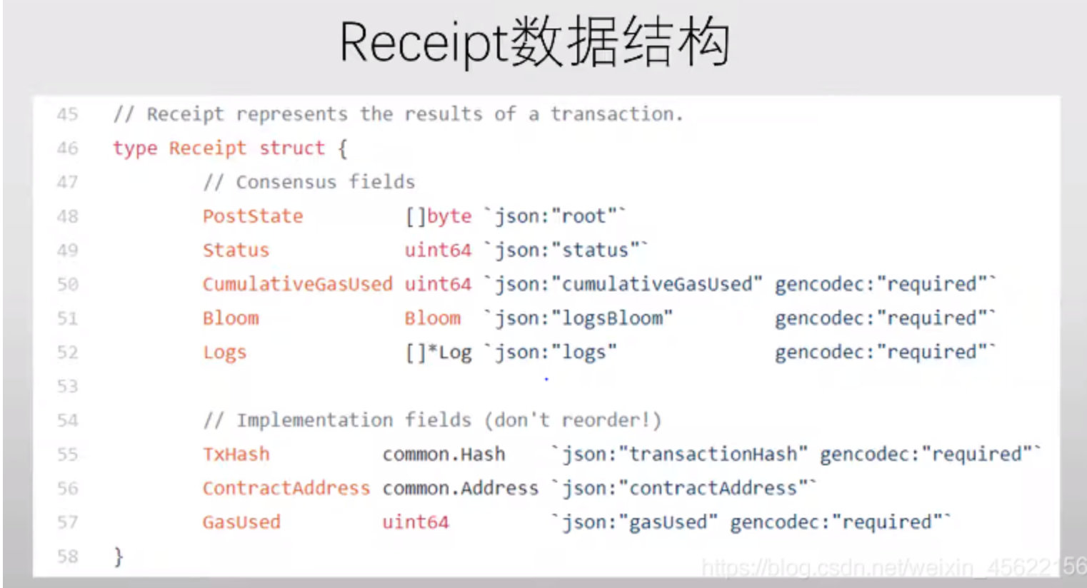 三棵树里面,每个交易执行完之后形成一个收据,下图是收据的内容,其中status域会告诉你这个交易的执行情况。