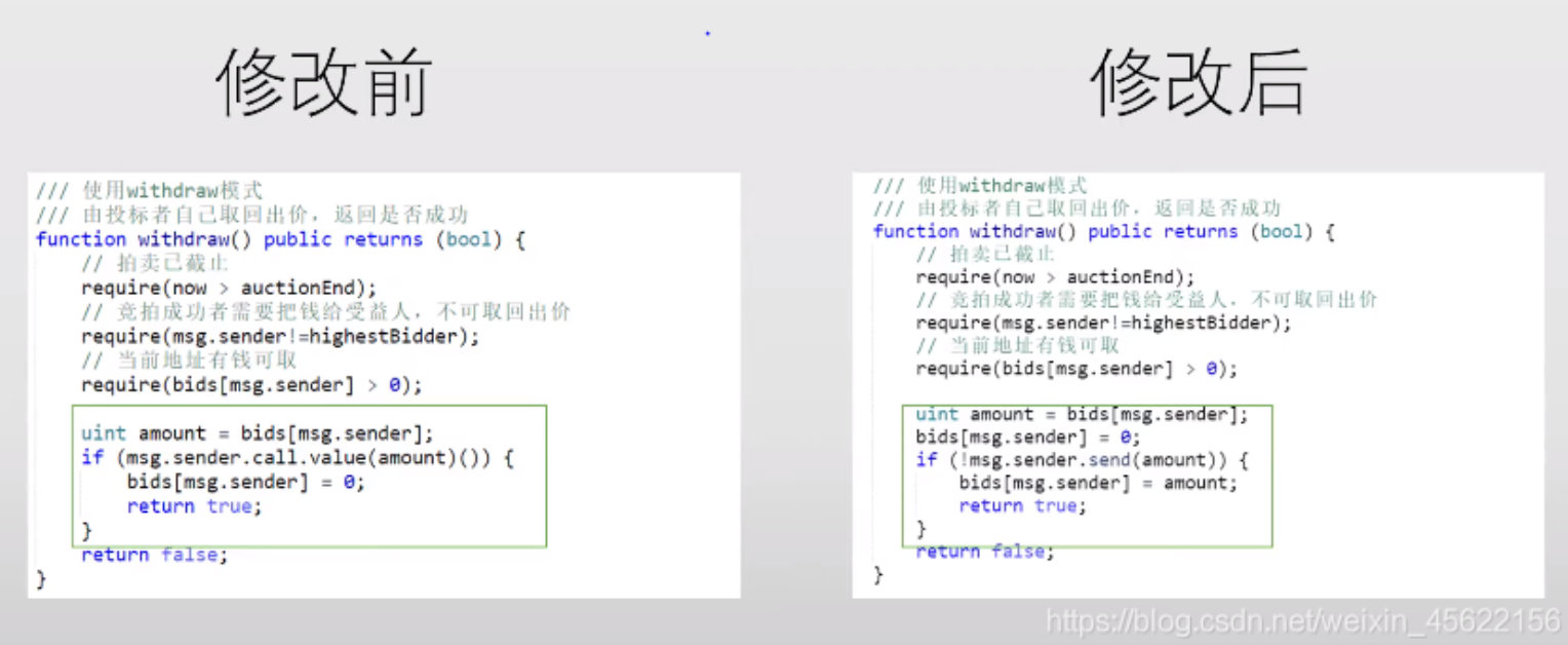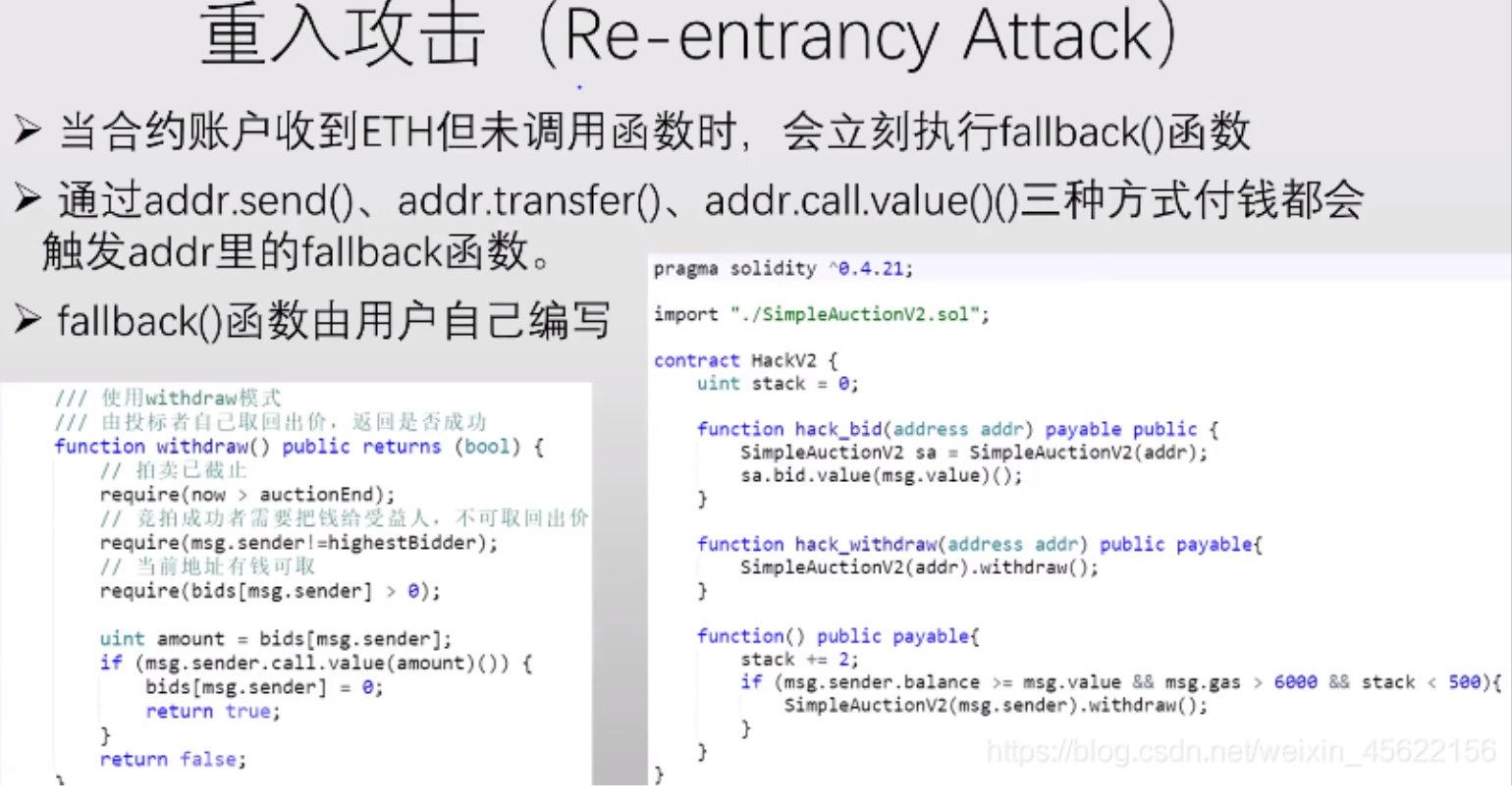 问题在于右边最后一个函数fallback函数又把钱取了一遍,hack_withdraw调用拍卖合约的withdraw函数的时候,左边执行到If(msg.sender)会向黑客合约转账,msg.sender就是黑客的合约,把他当初出价的金额转给他,右边合约最下面又调用了拍卖函数的withdraw函数去取钱,这里的msg.sender就是拍卖合约,因为是拍卖合约把钱转给这个合约的,左边的拍卖合约又开始执行到if,再转一次钱。注意黑客合约账户的清零的操作(左下角),只有在转账交易完成之后才进行,但是前面的转账交易已经陷入到和黑客合约的递归调用当中,根本执行不到清零后面,导致黑客按照自己的出价价格不停地从拍卖合约中取钱,只有第一次是自己的出价,其他都是合约里面的。