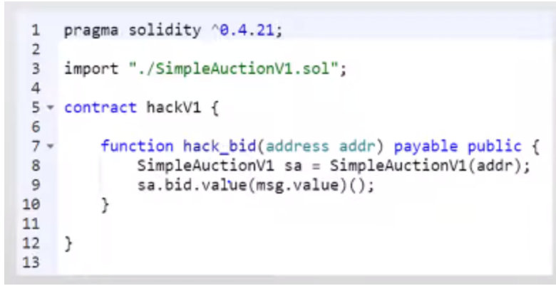 这个合约只有一个函数,hack_bid,参数是拍卖合约的地址,把它转成拍卖合约的实例,然后调用拍卖合约的bid函数,把钱发送过去。这是一个合约账户,合约账户不能自己发起交易,得有一个黑客从他自己的外部账户发起一个交易,调用这个合约的hack_bid函数,这个函数再调用拍卖合约的bid函数,把他自己收到的转过来的钱,黑客外部转过来的钱,再转给拍卖合约中的bid函数就参与拍卖了。