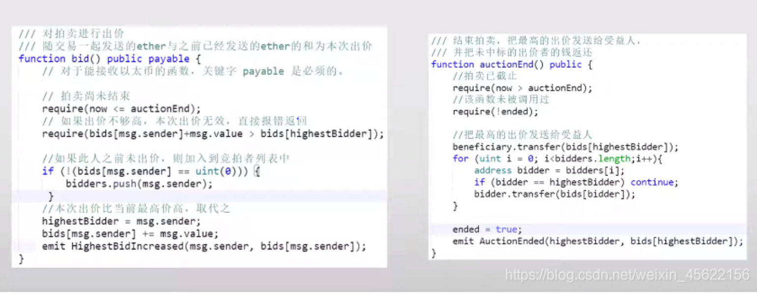 下面两个是拍卖用的两个函数,左边是竞拍bid函数,竞拍的时候发起一个交易调用拍卖合约中的bid函数,bid虽然没有参数,但是在msg.value发起这个调用的时候转账转过去的以太币数目,就是出的竞拍价格。