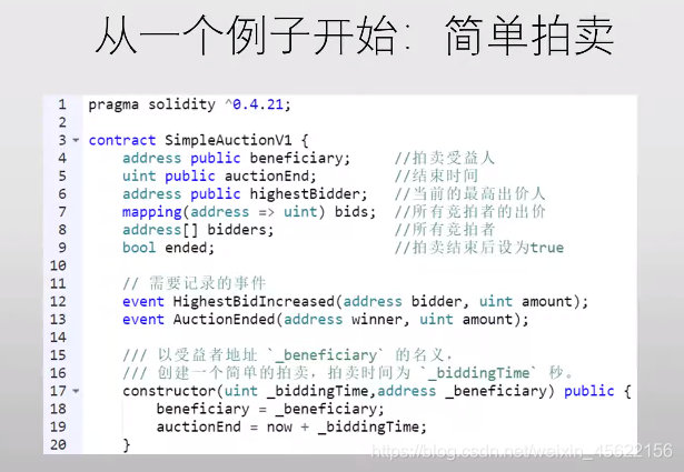 拍卖规则:拍卖结束之前每个人都可以去出价去竞拍,竞拍的时候为了保证诚信,需要把竞拍的价格相应的以太币发过去,比如出一百个以太币,你用bid函数竞拍的时候,要把100个以太币发送到智能合约,并锁在里面直到拍卖结束,不允许中途退出,可以加价,拍卖结束之后,highestBidder的出价的钱数会给受益人beneficiary,受益人应该把拍卖物也给最高出价人。其他没有竞拍成功的人可以把钱再取出来。竞拍可以多次出价,补差价发到智能合约里就可以,出价有效的话必须保证加价之后的出价高于之前的最高出价,否则就是无效(非法)的。constructor构造函数在合约创建的时候会记录受益人是谁,结束时间是什么时候。