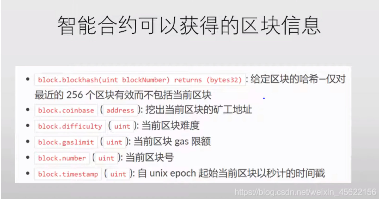 比如说外部账户A,调用合约C1,合约中有一个函数f1,f1又调用另外一个合约C2,里面有一个函数f2,那么对这个f2函数,msg.sender是C1合约,tx.origin是账户A。msg.gas是当前这个调用还剩下多少汽油费,这个决定了我还能做哪些操作。包括你要想再调用别的合约,前提是还有足够的汽油费剩下来,msg.data就是数据域,里面写了调用的函数和这个函数的参数取值,msg.signature是msg.data的前四个字节,就是函数标识符,调用的是哪个函数。now和timestamp是一个意思,智能合约里没有办法获得很精确的时间,只能获得跟这个当前区块的一些信息时间。