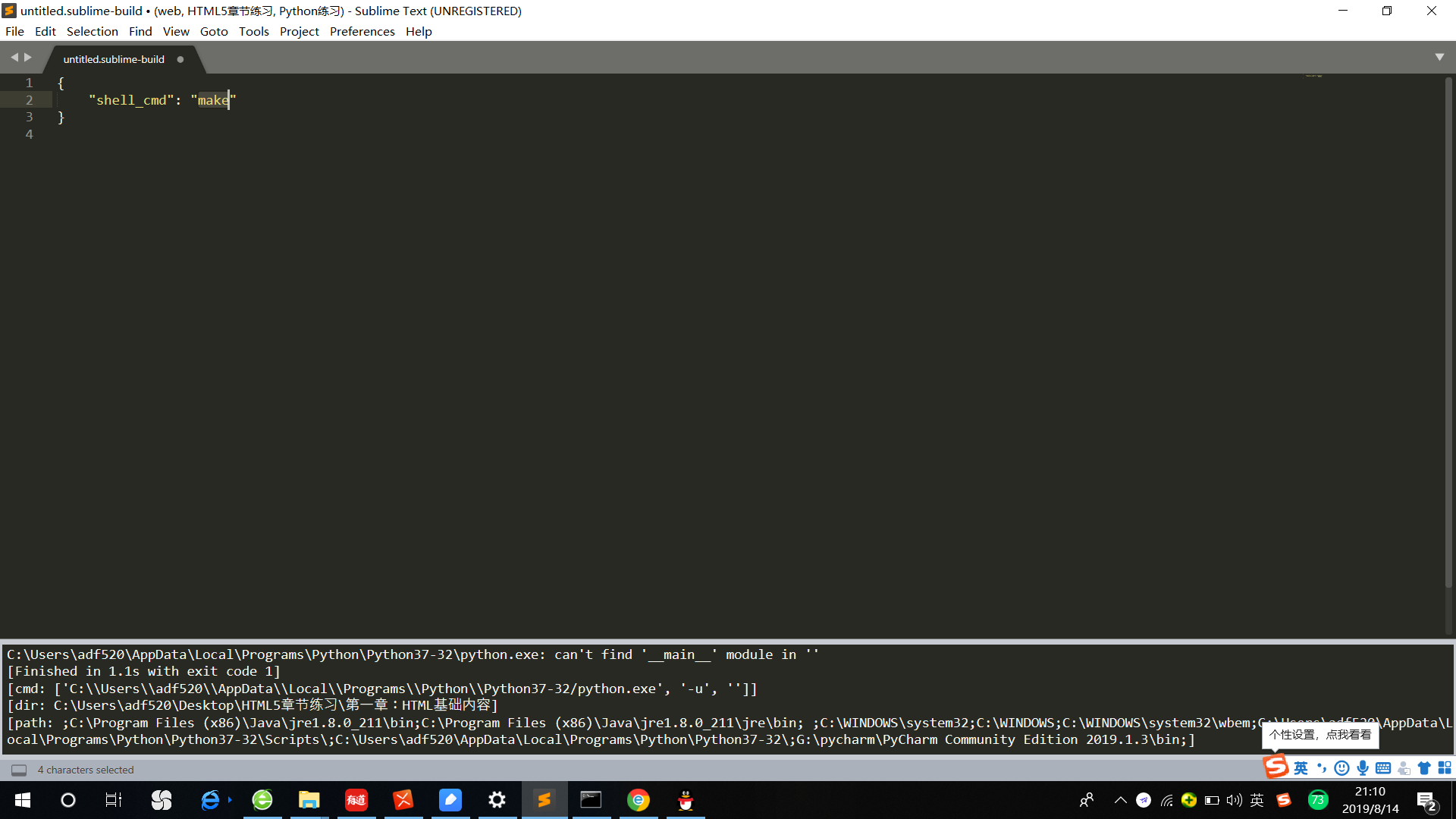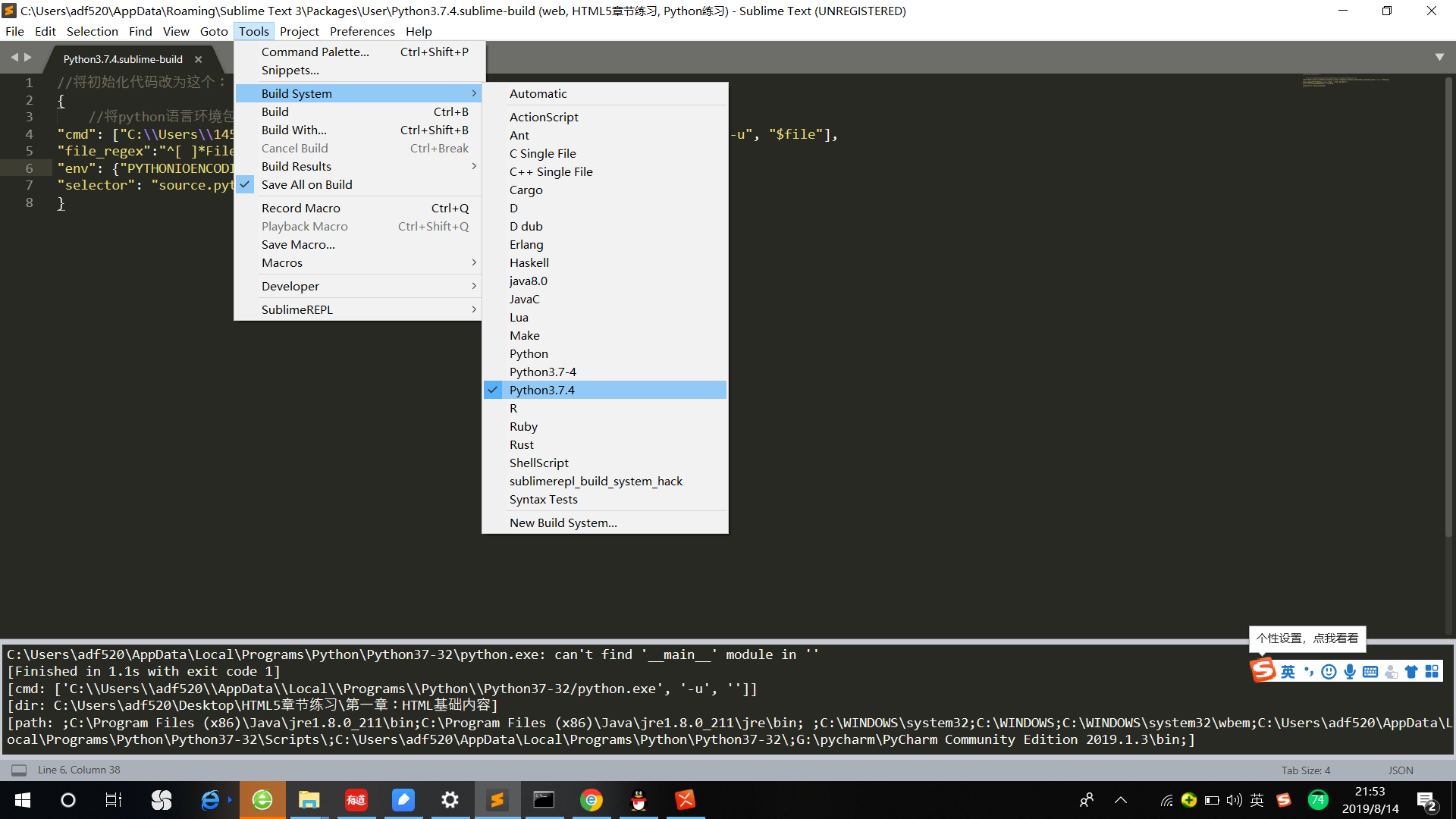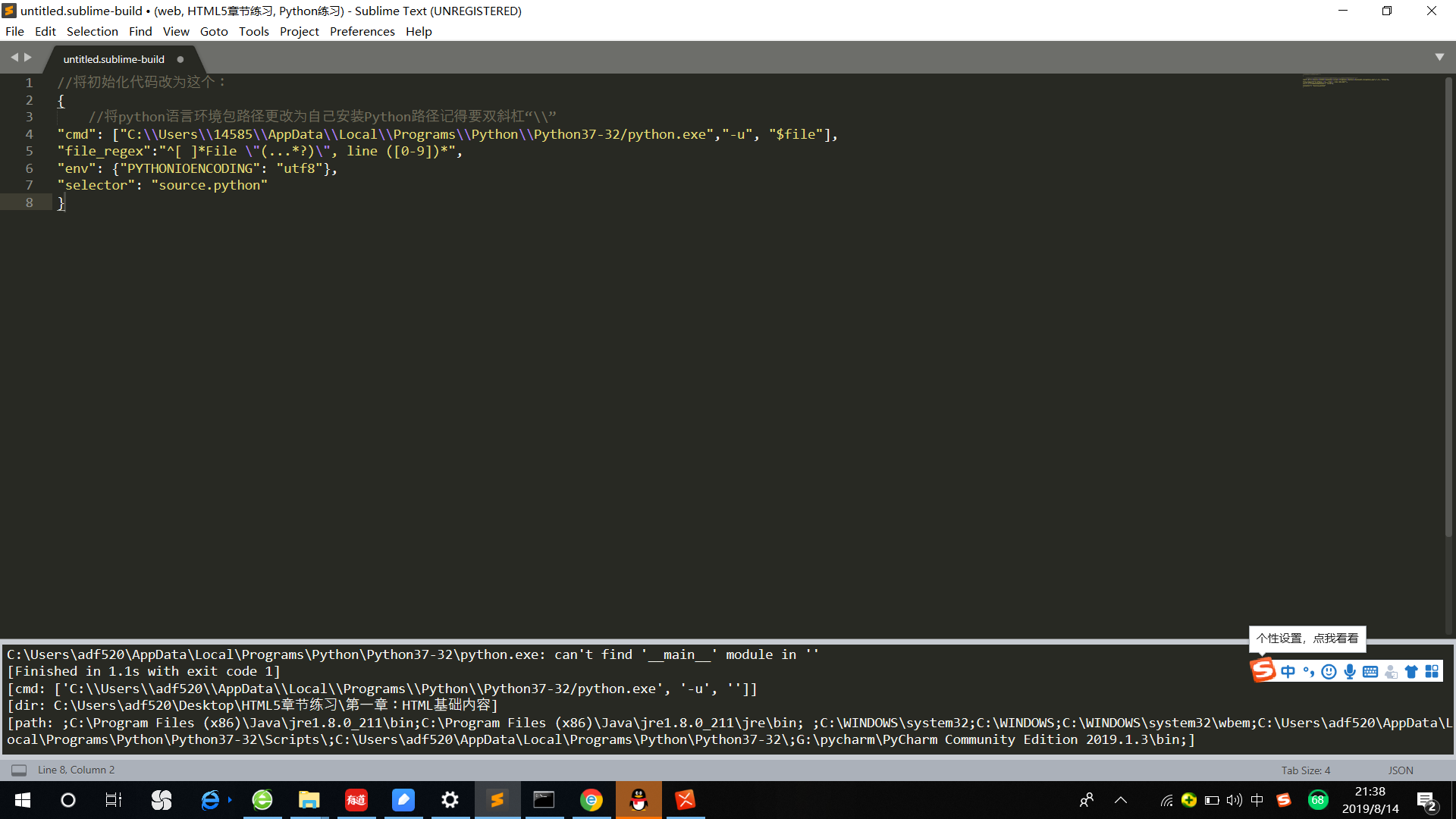 //将初始化代码改为这个: { //将python语言环境包路径更改为自己安装Python路径记得要双斜杠“\\” "cmd": ["C:\\Users\\14585\\AppData\\Local\\Programs\\Python\\Python37-32/python.exe","-u", "$file"], "file_regex":"^[ ]*File \"(...*?)\", line ([0-9])*", "env": {"PYTHONIOENCODING": "utf8"}, "selector": "source.python" }