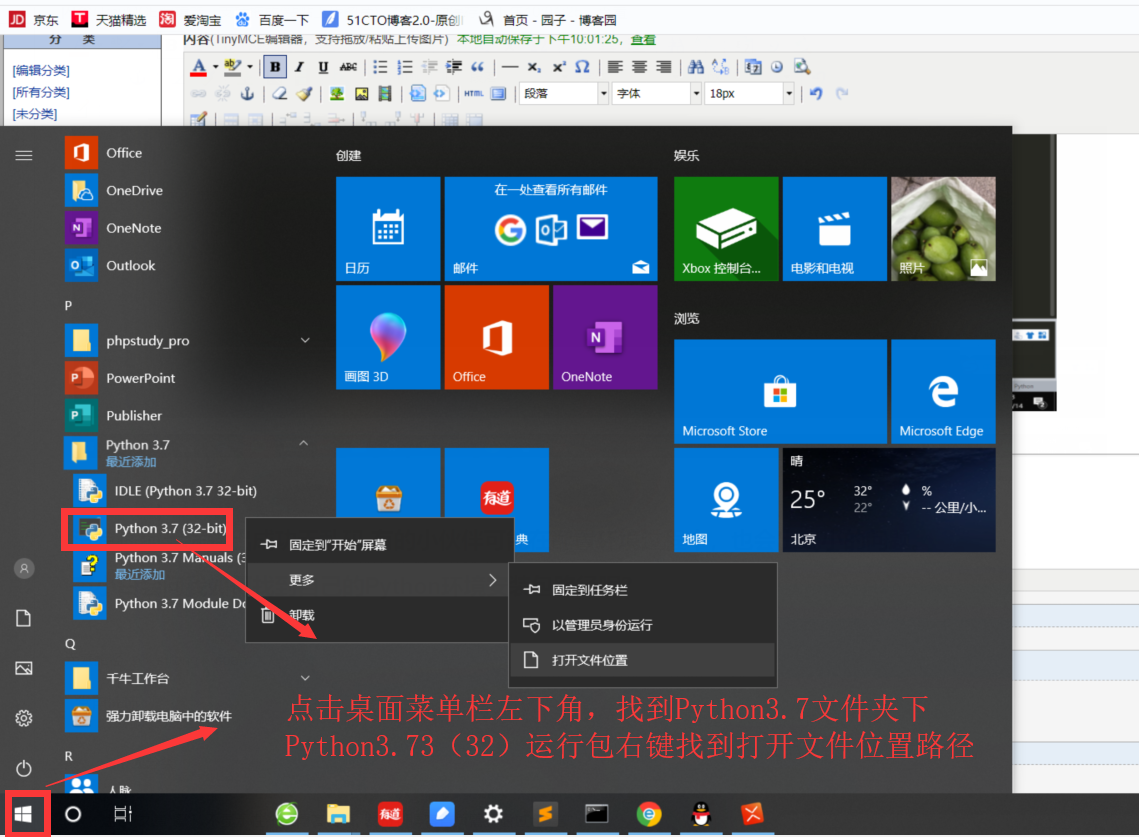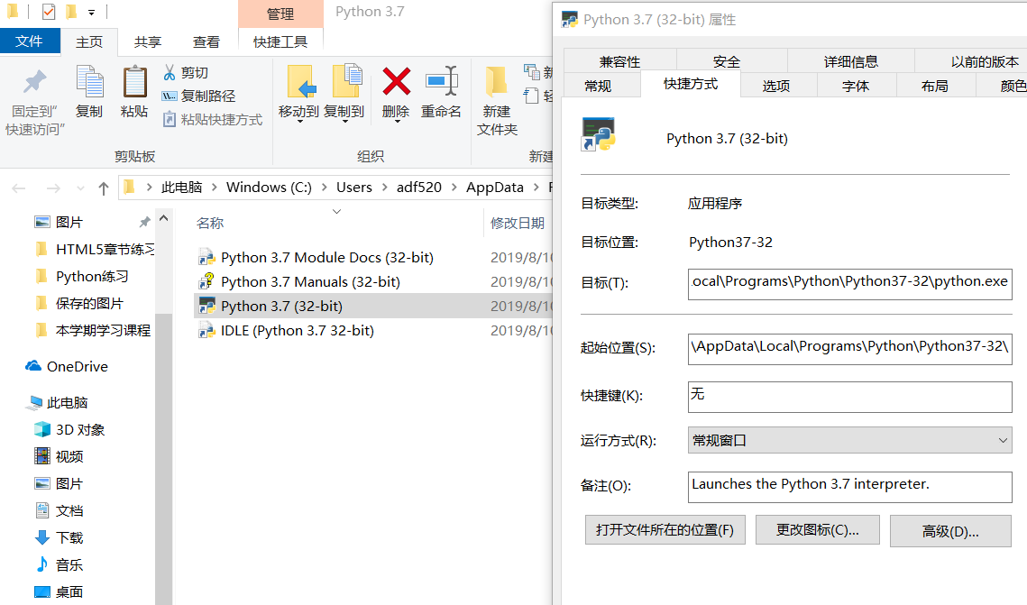 进入打开文件位置路径后,继续右键点击Python3.7(32-bit)会出现弹框选择属性,然后继续点击打开文件所在的位置: