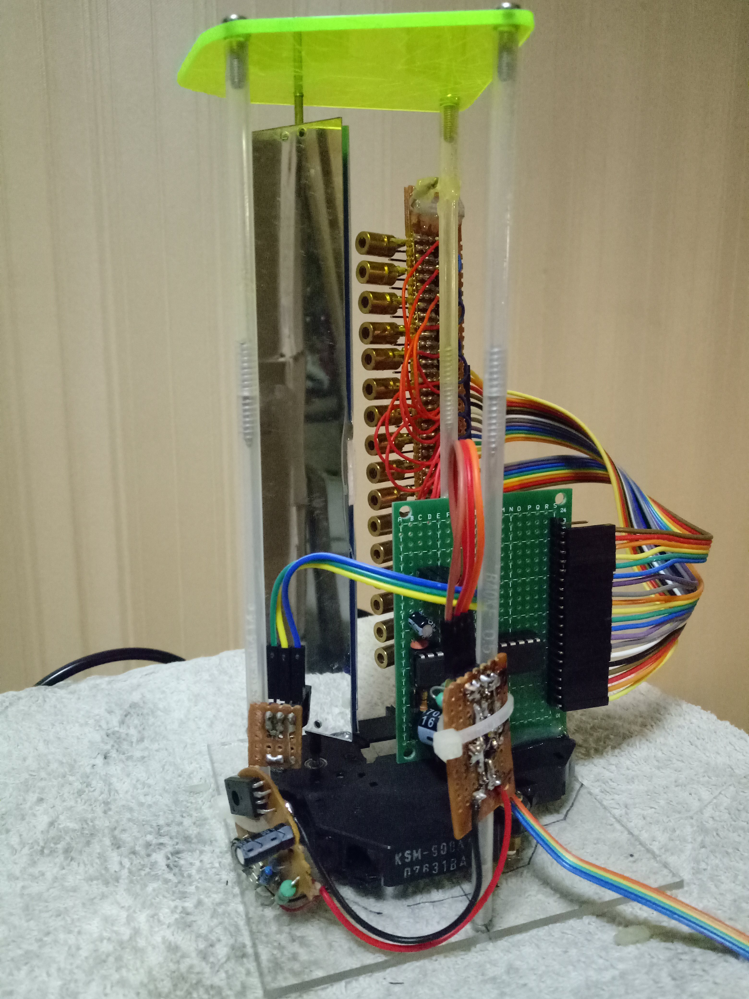 电机带动反光镜(尽量)匀速旋转,红外对管检测镜面位置,检测到镜面位置给单片机外部中断信号,单片机开始计时。这个时间结束的时候就是镜面转到开始显示的位置,这时开始点亮激光管,从这里开始原理就和摇摇棒一样了。