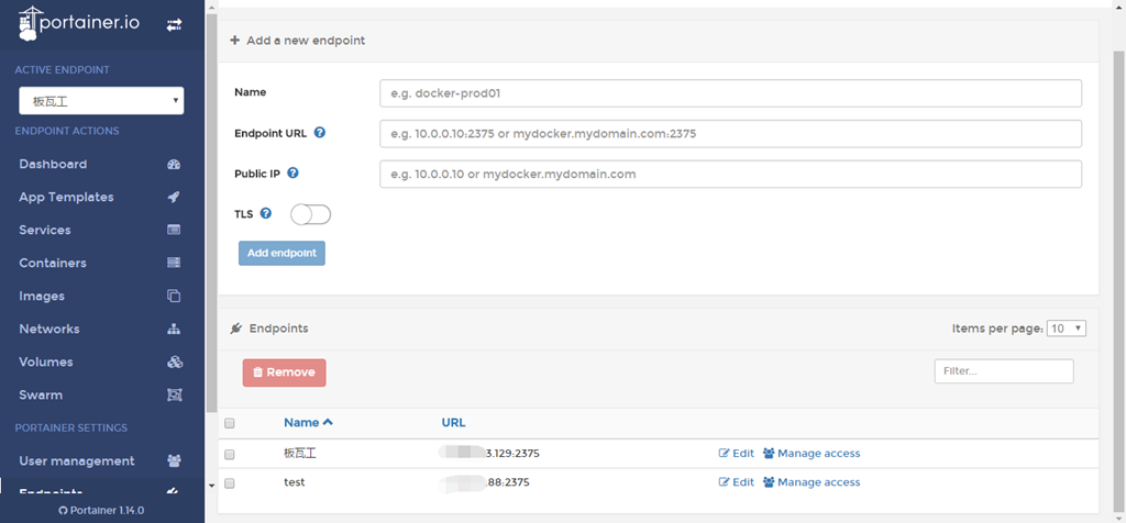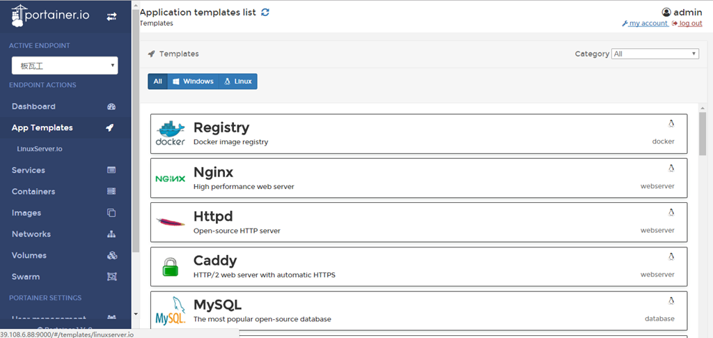 # docker run -d -p 9000:9000 -v /var/run/docker.sock:/var/run/docker.sock portainer/portainer -d 参数以detach方式运行 -p 将容器工作端口映射至物理机端口 HOST端口:容器端口 -v 将容器目录挂载(映射)到物理机对应位置,这里指定通讯方式为sock portainer/portainer 为镜像名称 portainner 也支持用TCP通讯,启动命令 # docker run -d -p 9000:9000 portainer/portainer -H tcp://<REMOTE_HOST>:<REMOTE_PORT>
