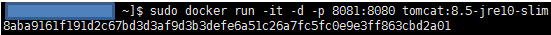 sudo docker run -it -d -p 8081:8080 tomcat:8.5-jre10-slim