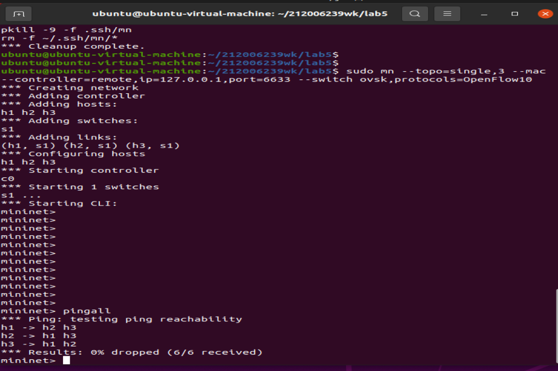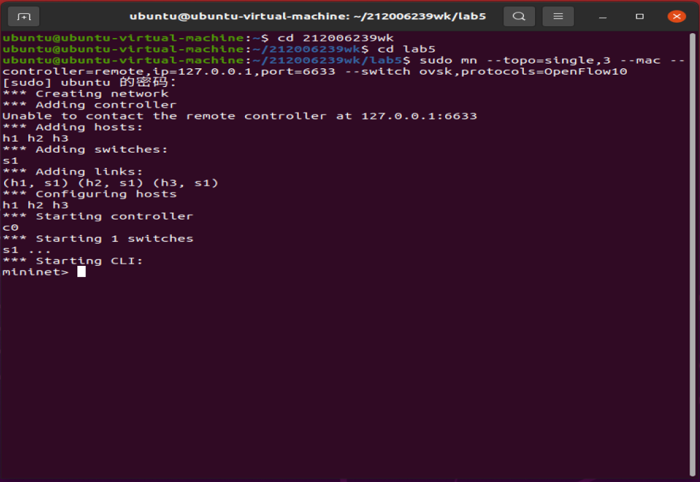 命令:sudo mn --topo=single,3 --mac --controller=remote,ip=127.0.0.1,port=6633 --switch ovsk,protocols=OpenFlow10