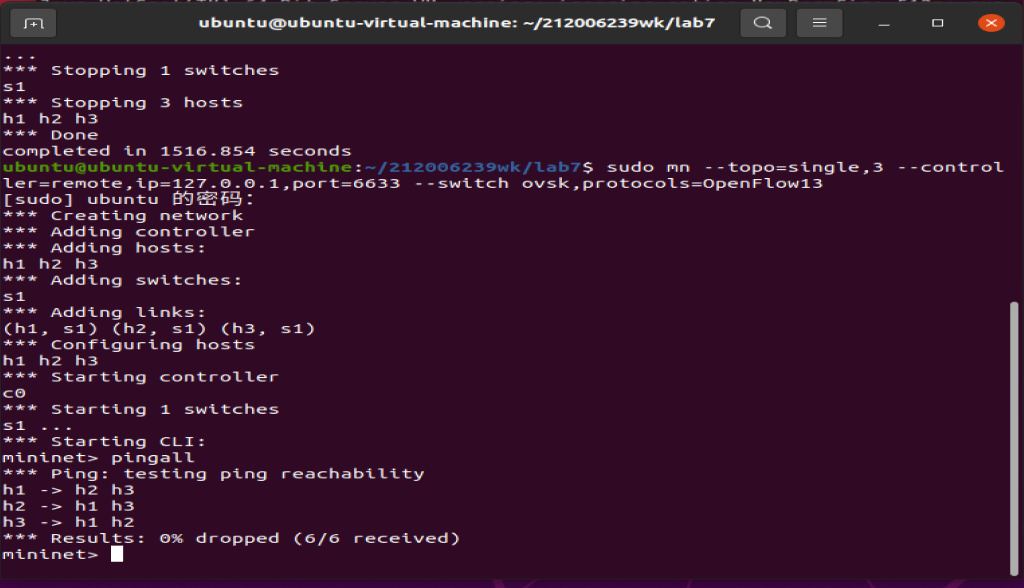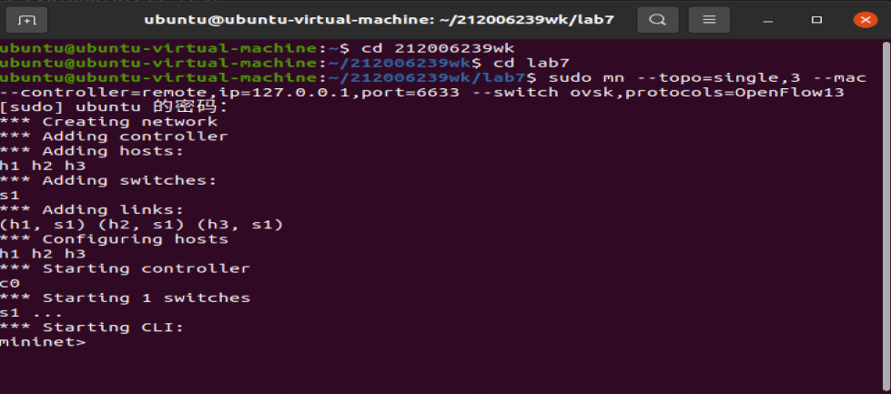 命令:sudo mn --topo=single,3 --controller=remote,ip=127.0.0.1,port=6633 --switch ovsk,protocols=OpenFlow13
