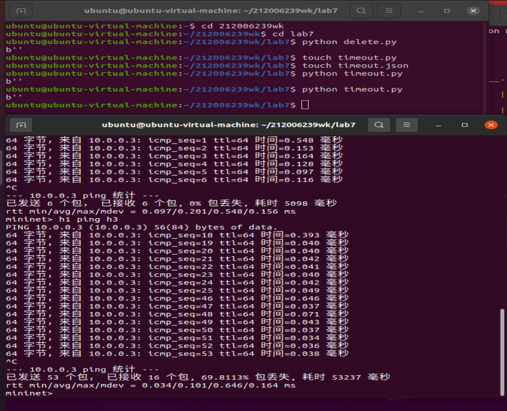 - 编写timeout.py及timeout.json,调用OpenDaylight的北向接口下发硬超时流表,实现拓扑内主机h1和h3网络中断20s
