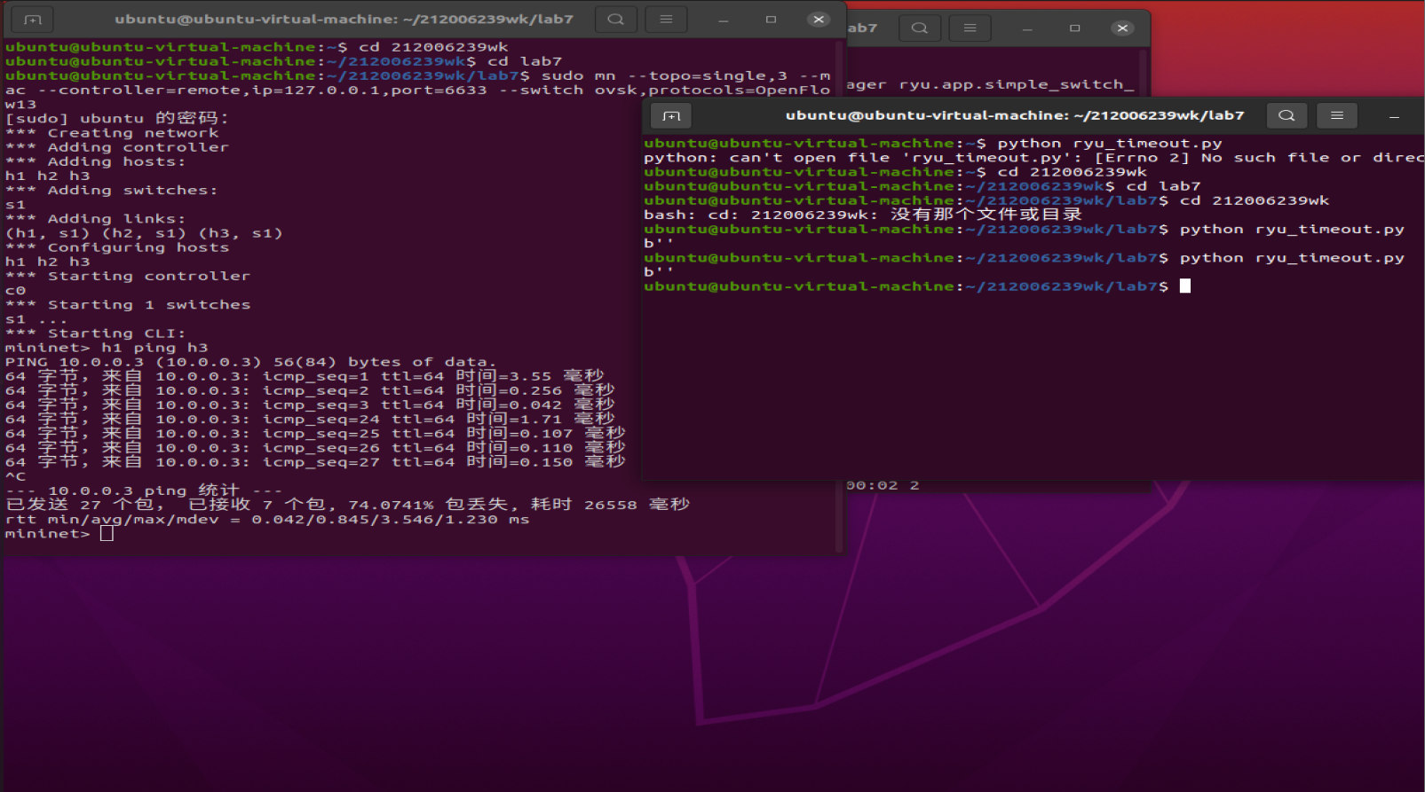 (1)编写ryu_timeout.py及ryu_timeout.json,调用Ryu的北向接口实现硬超时流表下发