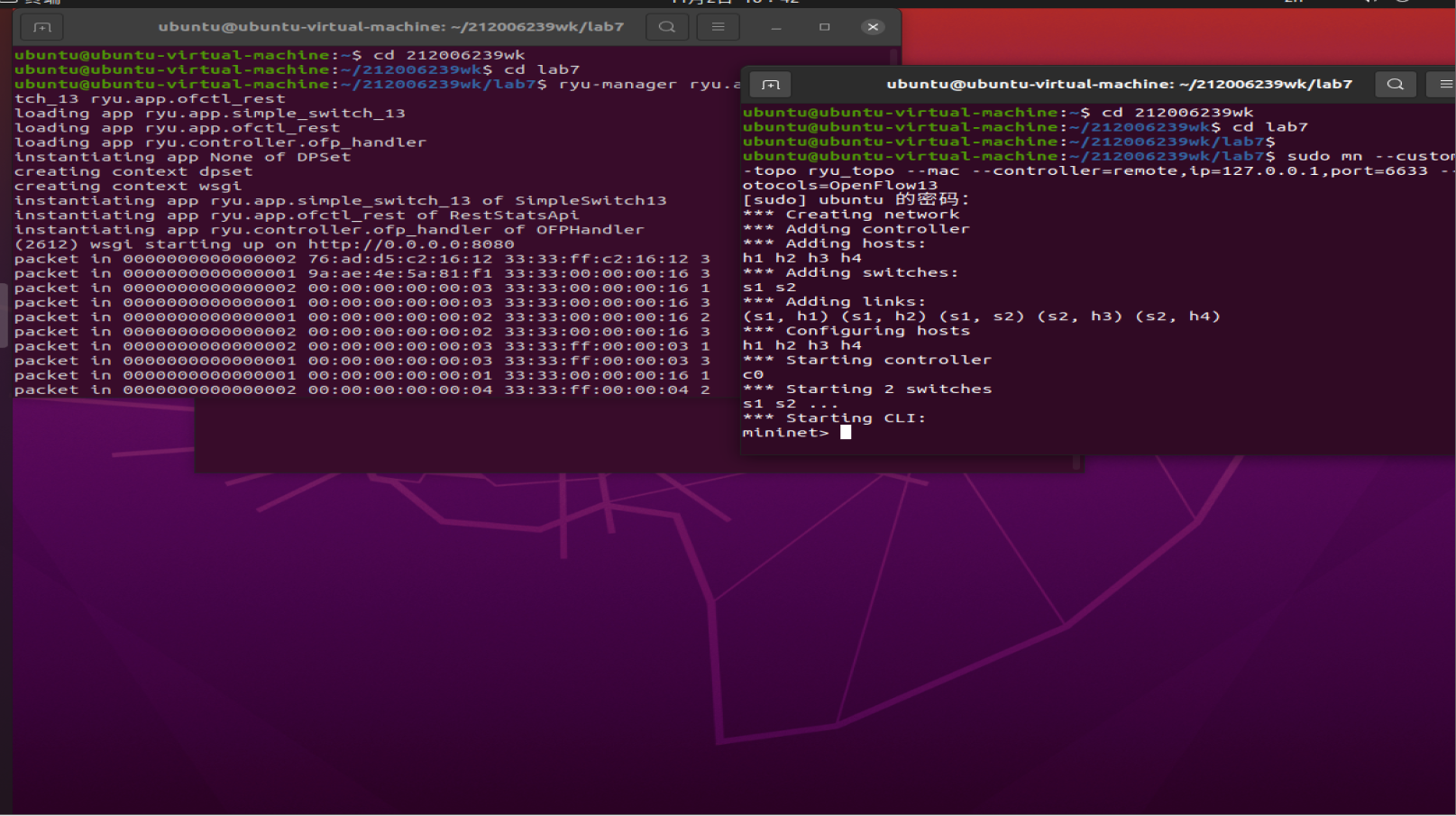 命令:sudo mn --custom ryu_topo.py --topo ryu_topo --mac --controller=remote,ip=127.0.0.1,port=6633 --switch ovsk,protocols=OpenFlow13