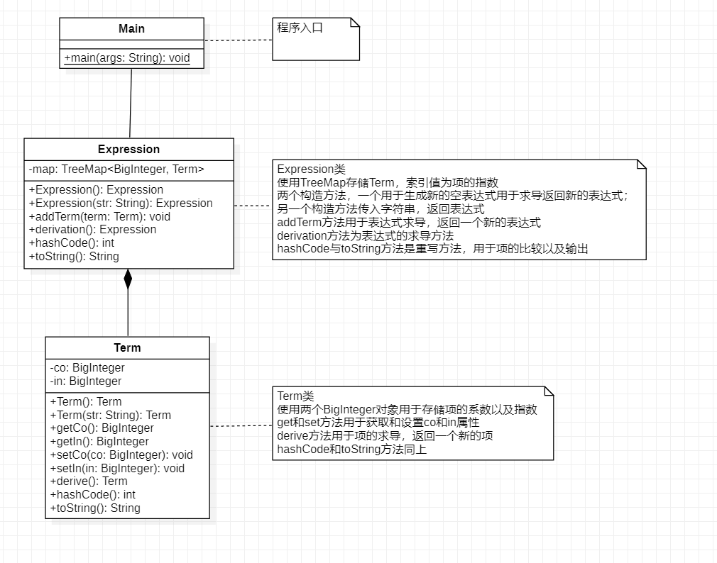 Expression 类和 Term 类是参考第一次实验构造的。由于第一次作业项中只有关于x的幂因子以及常数因子,因此 Term 的成员变量设置了系数和指数,这样在读入字符串进行分析时便可以做到化简。Expression 类则设置了 TreeMap 的结构存储 Term 对象,并使用 Term 对象中的指数成员作为索引值。由于各个类的建立有了好的参考,因此我在第一次作业中的最大难点就是建立合适的正则表达式进行项与因子的解析。在求导部分,只需按照正常的求导公式运算即可。需要注意的是,在求导时我没有进行特殊化处理,系数为 0 的项求导后系数变为 -1 ,这显然是错误的,因此我也参考了第一次实验中的代码,在对所有项进行求导后,去除所有系数为 0 的项。