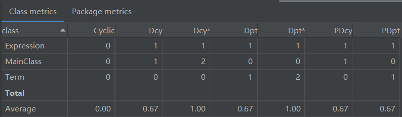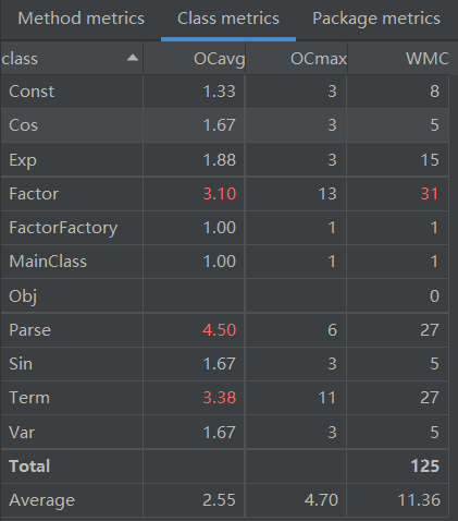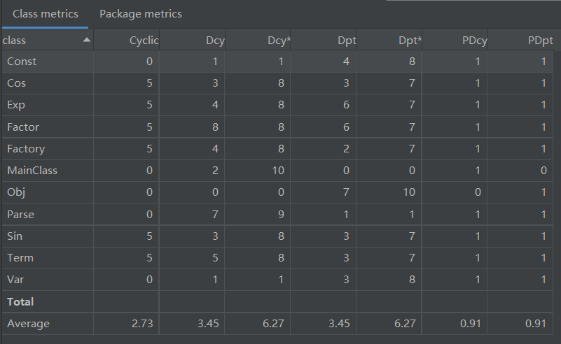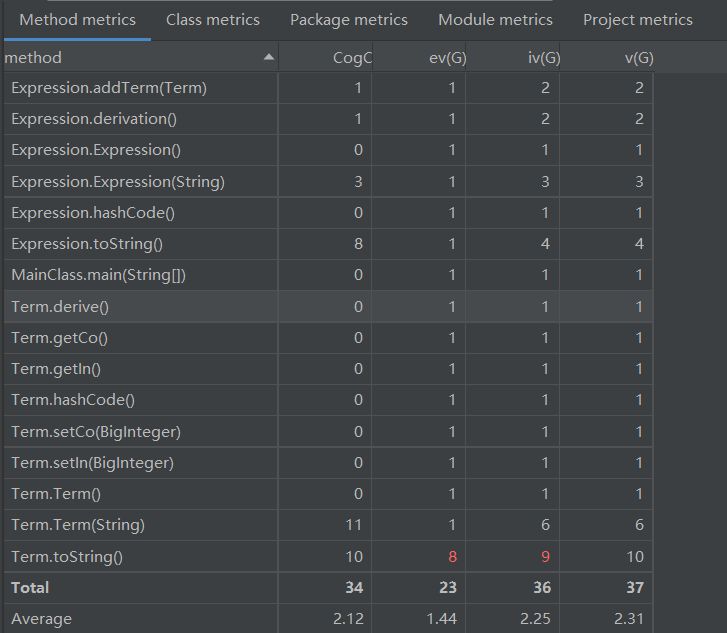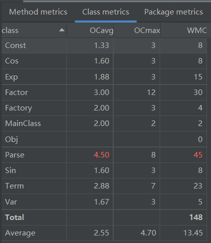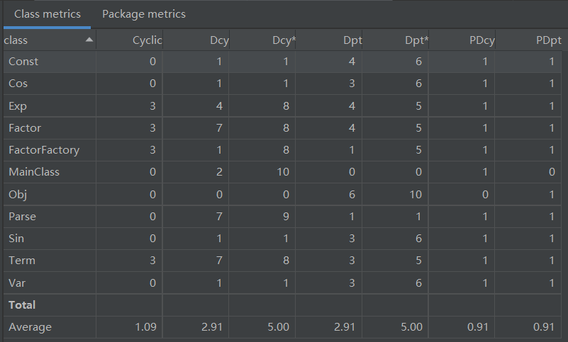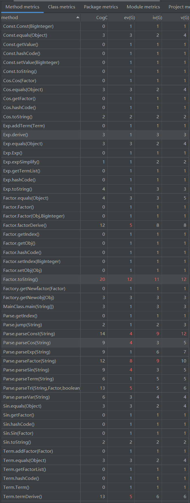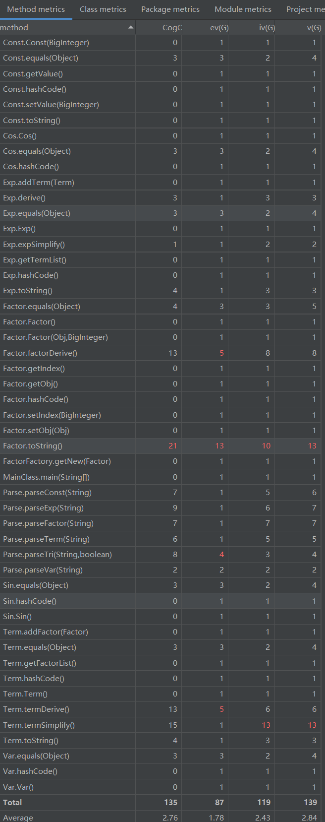 由以上数据可以看出,Factor 类的 toString 方法比较复杂,这是因为调用了太多 Obj 类的对象判断;Term 类的化简方法也较为复杂,也是因为调用了太多 Obj 类的对象判断。从类的层次看,由于存在一定的递归情况,Term,Factor,Parse 类的复杂性比较高。对于类之间的依赖性,由于主体架构比较好,因此耦合度较低。
