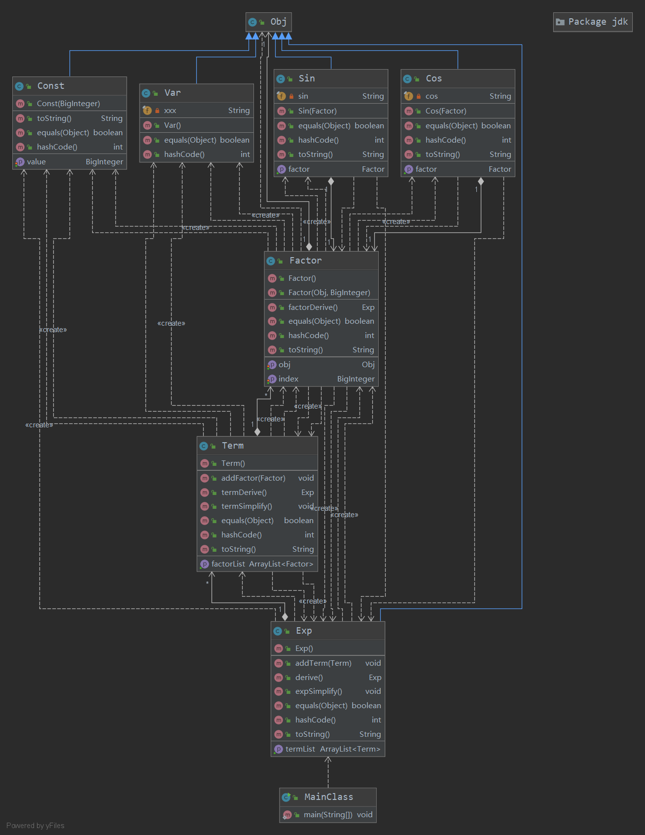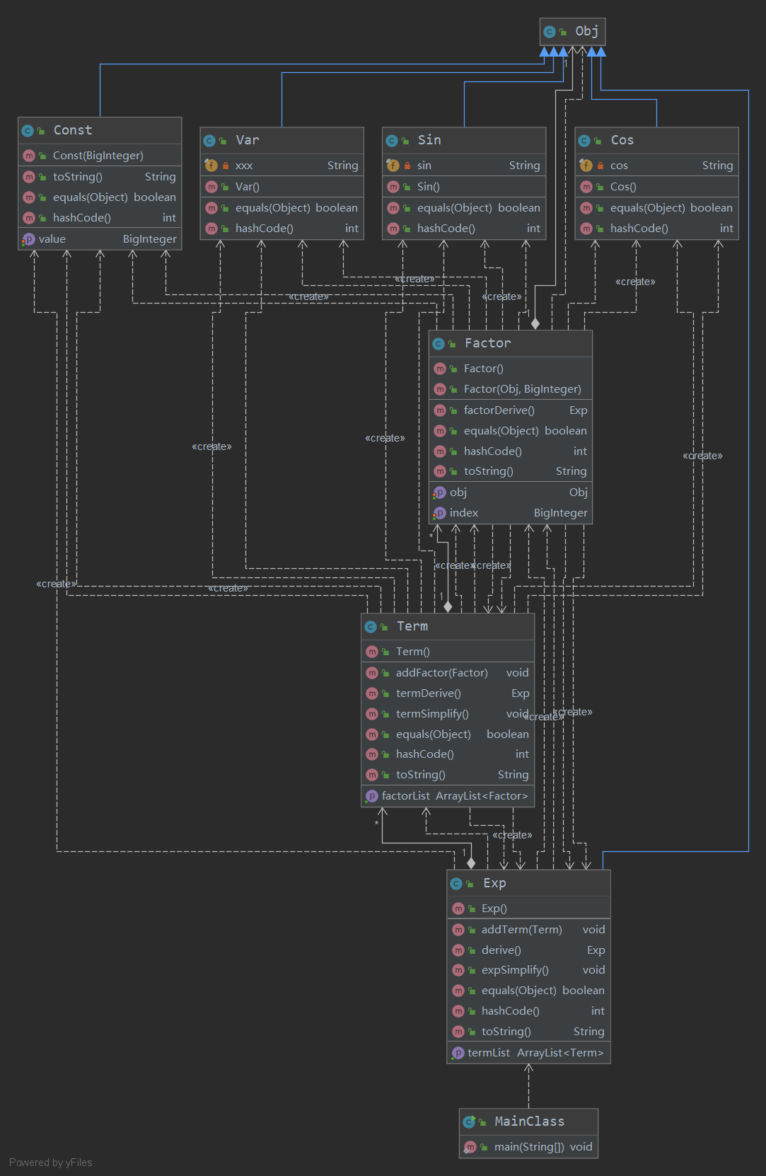 恰逢第二周的研讨课上有同学提出了利用递归下降方法对字符串进行解析的方法,也有同学分享了接下来的作业的架构分享,因此最终我采用了递归下降的方法对字符串进行解析。表达式类 Exp 与项类 Term 仍保留,但其作用已发生变化,两者均用 ArrayList 存储下一级对象。同时新建 Term 下一级类 Factor 类,此类的成员变量为该因子指数 index 以及该因子类型 obj。因子类型为 Obj 类,子类包括 Const 常数类、Var x 变量类、Sin sin(x) 类、Cos cos(x) 类以及 Exp 类(针对表达式因子)。这些子类中除 Exp 类外,Const 类包括一个成员变量 value,其为常数因子的值;其余的类均无成员变量,仅作为一种标识符。架构的类图如下所示: