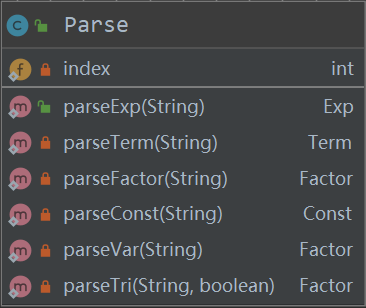 使用递归下降对表达式解析是一项复杂的工作,因此我将这个过程封装为单独的一个 Parse 类,它包括一个 public 的 ParseExp 方法 以及其他均为 private 的 Parse 方法,且由于需要在 main 方法里使用,因此均为 static。同时,递归下降方法需要一个全局性的对于字符串的当前下标,因此创建了 index 成员变量。具体如下:
