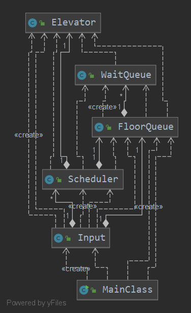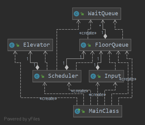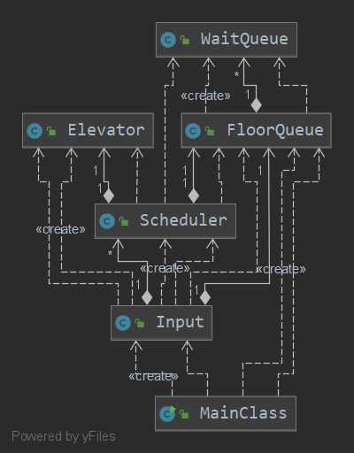 WaitQueue 为一层楼中候乘乘客的队列,将所有层的 WaitQueue 对象组合成一个 ArrayList 对象并封装成为一个新的类 FloorQueue,由于 ArrayList 类是线程不安全的,这样的设计有利于保证共享对象的访问安全。设置了一个输入线程 Input,通过调用课程组提供的接口向 FloorQueue 对象中相应楼层的 WaitQueue 对象添加读入的乘客请求。