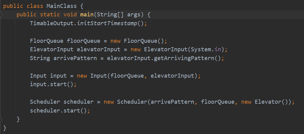 首先,为了实现多部电梯的产生以及实现电梯的动态加入(在我的架构中,电梯即是调度器),我将调度器线程的生成位置从 main 线程更改到了 input 线程中来。这样可以将所有可能的电梯(调度器)的生成都封装到同一个类中。初始的三个调度器线程在 input 线程的开始就被初始化并开始运行,之后的新调度器则根据读入的指令动态生成并开始运行,如下所示: