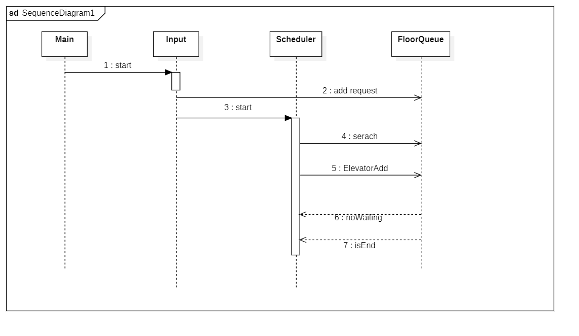 在架构设计中,只有两个线程:Scheduler 线程和 Input 线程,这两个线程都是由 main 线程调用的,而调度器线程与输入线程进行交互的方式就是接收同一个候乘乘客队列 floorQueue ,并共享候乘乘客队列:input 线程向 floorQueue 中写入乘客请求,scheduler 线程读取 floorQueue 并取出乘客请求,也就是生产者-消费者模式。这也是两个线程之间唯一的交互方式。而在交互过程中,又涉及到了共享对象的上锁与同步问题,这一部分将另开一节进行阐述。