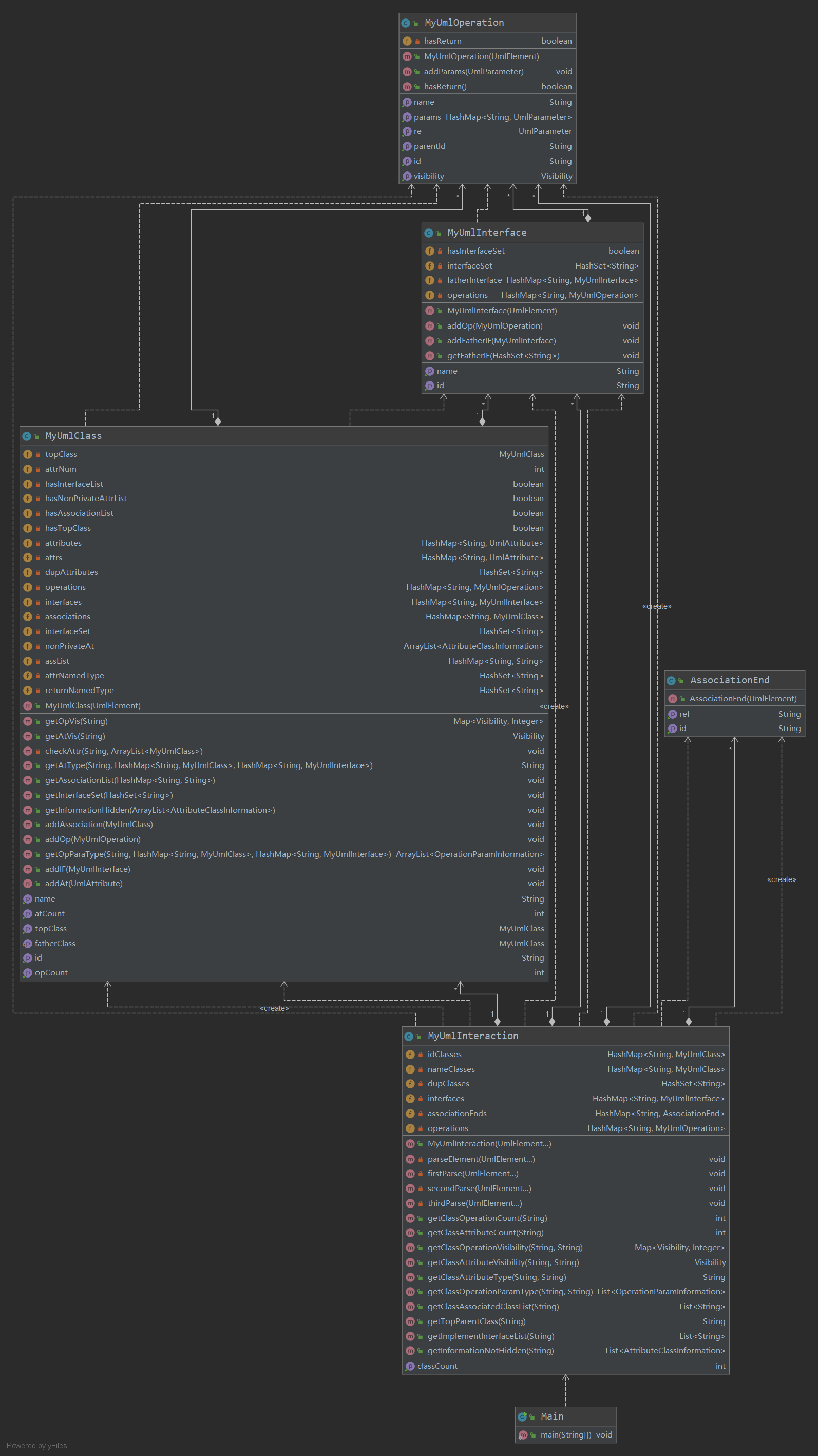 第二次作业添加了对 UML 顺序图与 UML 状态图的解析,基本方法与第一次作业中大致相同,只是需要解析的元素增多以及在解析过程增加了对新增元素的解析(Region、State、Lifeline、StateMachine、Transition、Interaction)并增加了解析次数。在解析中,第一次解析 StateMachine、Interaction,第二次解析 Lifeline 和 Region,第三次解析 Message 和 State。第四次解析 Transition 和 Event,最后一次解析对第四次解析获得的元素进行再一次解析。UML 类图如下: