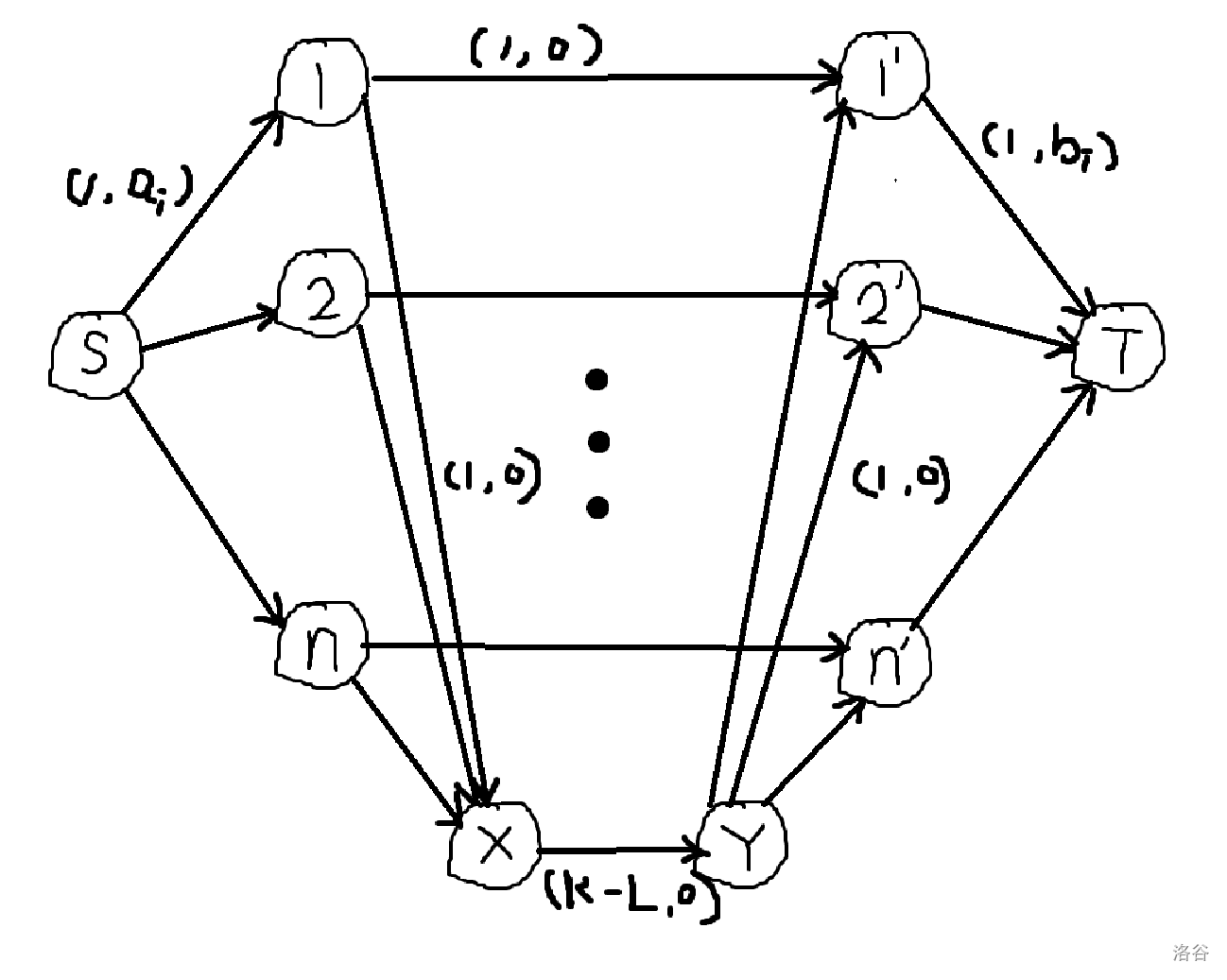 考虑模拟费用流。考虑建图,我们发现 \(a_i, b_i\) 同时选不太好刻画,于是考虑刻画只选 \(a_i\) 不选 \(b_i\) 的情况(显然与只选 \(b_i\) 不选 \(a_i\) 出现次数相同),即限制其至多出现 \(K - L\) 次。我们将这种情况视为选了 \(a_i\) 后更换位置选择了 \(b_j\)。考虑先拆点,\(S\) 向 \(1, 2, \cdots, n\) 连容量为 \(1\),费用为 \(a_i\) 的边,\(1', 2', \cdots, n'\) 向 \(T\) 连容量为 \(1\),费用为 \(b_i\) 的边,分别表示选择了 \(a_i, b_i\)。对于都选,即不更换位置的情况,我们 \(i\) 向 \(i'\) 连容量为 \(1\),费用为 \(0\) 的边。对于更换位置的情况,我们新建两个点 \(X, Y\),\(i\) 向 \(X\),\(Y\) 向 \(i'\) 连容量为 \(1\),费用为 \(0\) 的边,再 \(X\) 向 \(Y\) 连容量为 \(K - L\),费用为 \(0\) 的边即可。