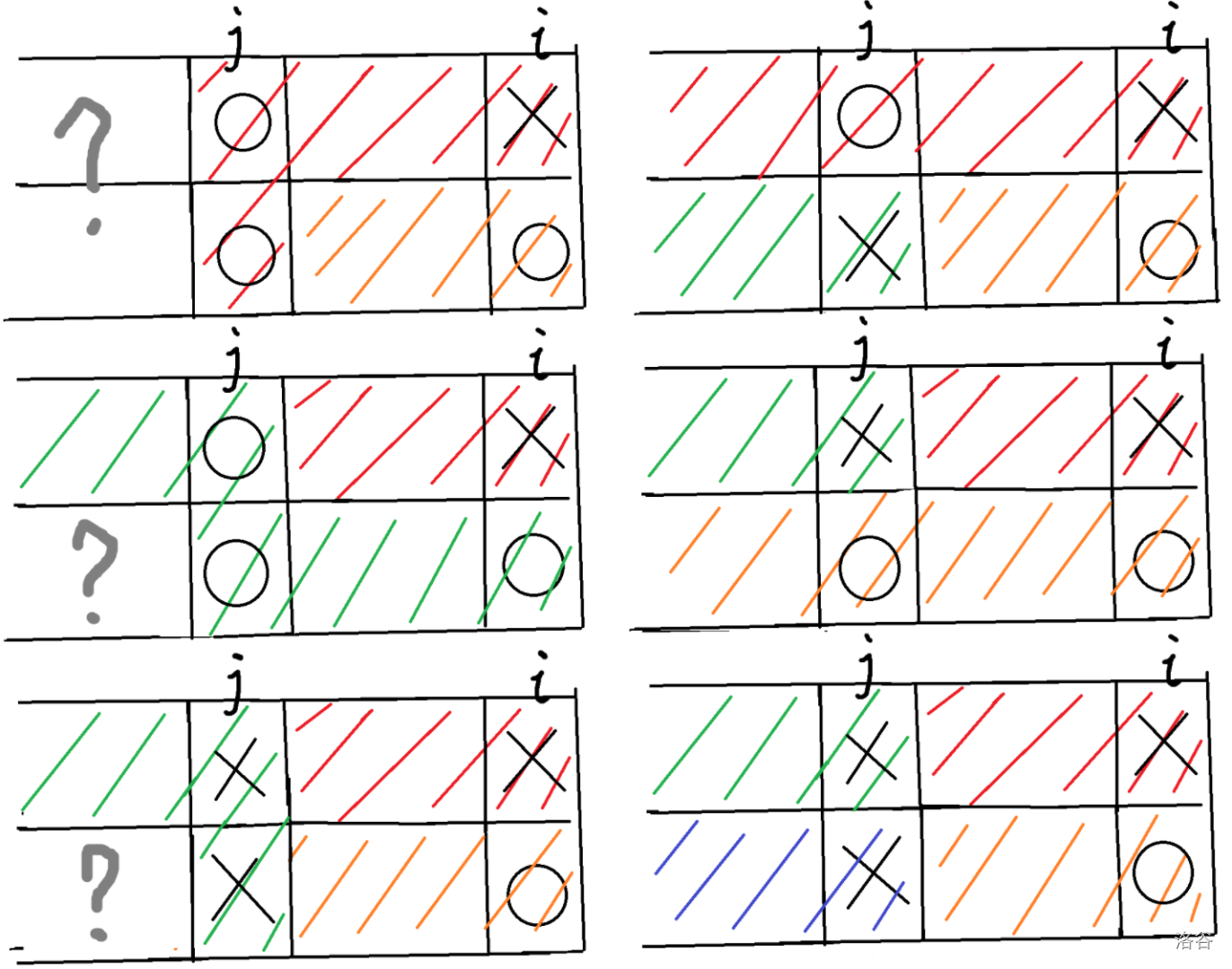 - 若两种条件均成立(对应第三行两幅图),则第 \(j\) 列状态为
