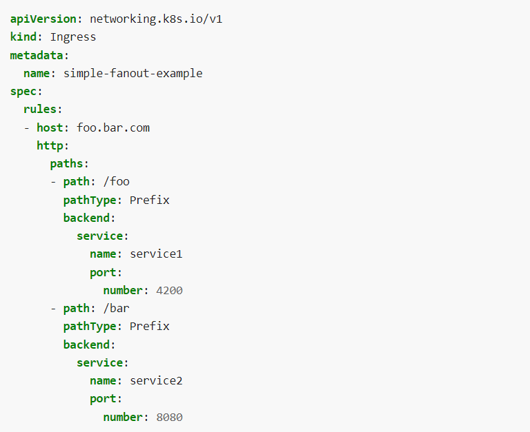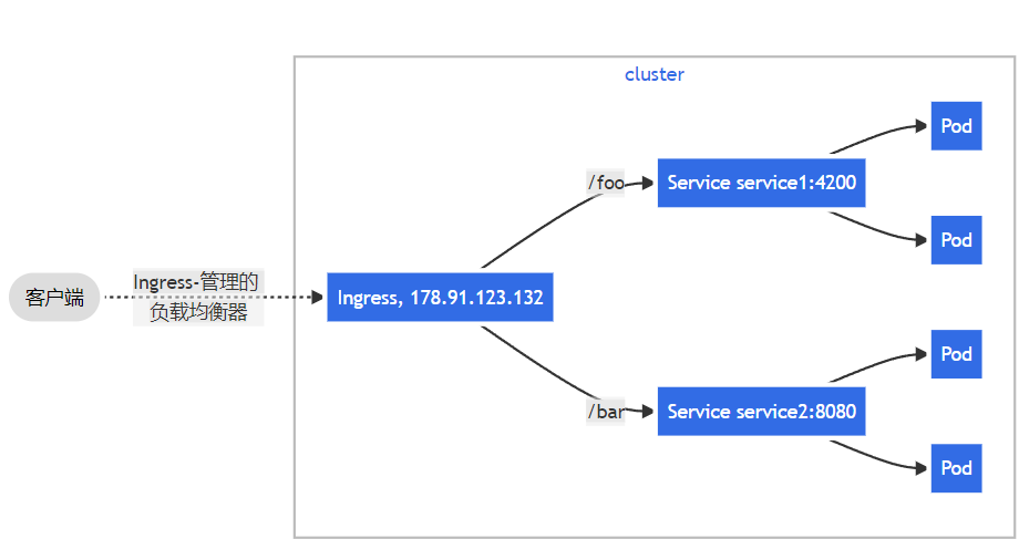 当我们访问foo.bar.com/foo时,ingress就会帮我路由到service1,访问foo.bar.com/bar时,ingress会路由到service2