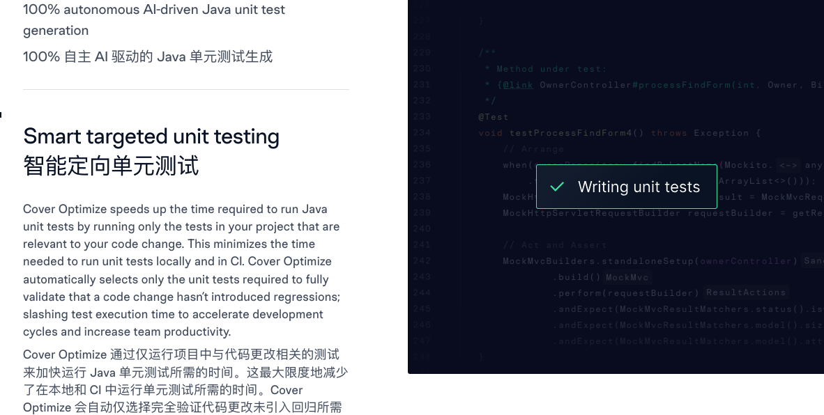 产品特点:代码覆盖率分析和自动化测试工具。一个自主的 AI 驱动的 Java 和 Kotlin 单元测试生成解决方案,可在本地和 CI 中大规模生成可靠的单元回归测试。