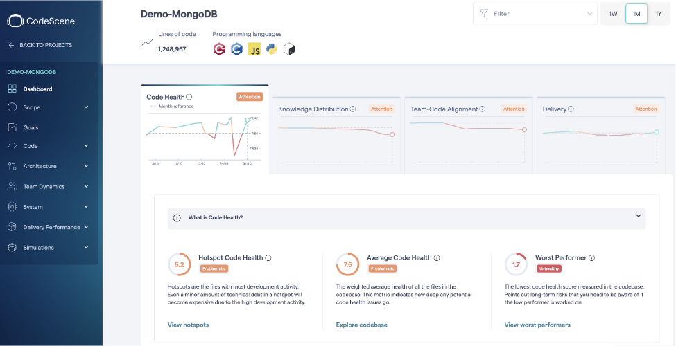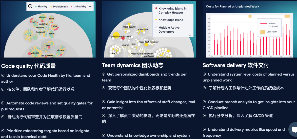 - 产品特点:代码健康分析工具,检测代码质量和风险。CodeScene 是一个代码分析和可视化工具。通过交叉引用代码质量、团队动态和交付输出等上下文因素,获取可操作的见解,以有效减少技术债务并交付干净的代码。