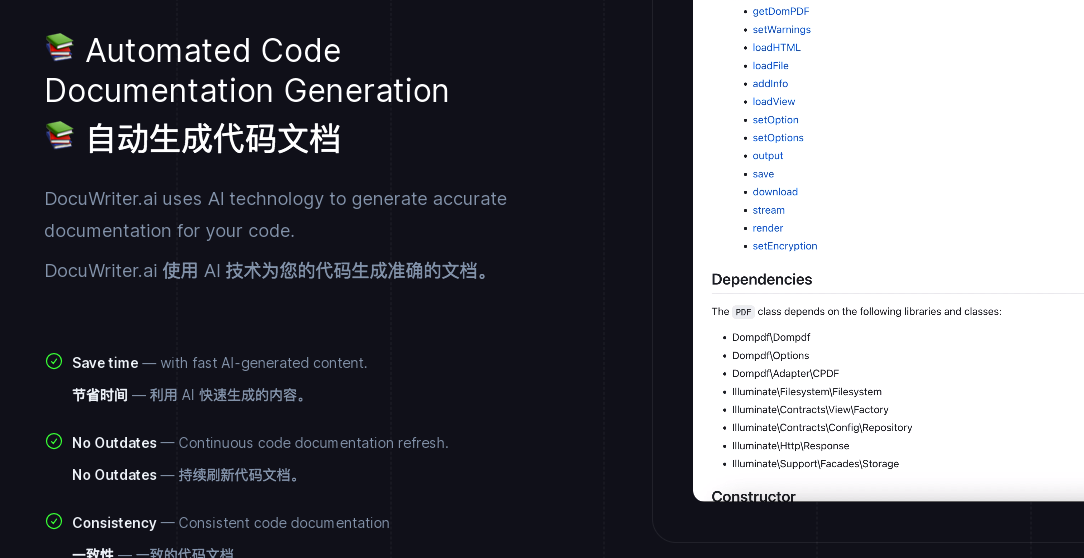 产品特点:自动化 AI 驱动的工具,用于从源代码文件生成代码和 Api 文档。