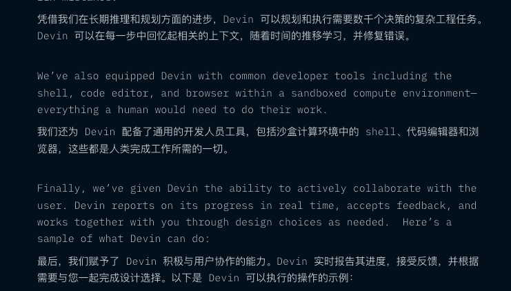 产品特点:虚拟人,世界上第一位完全自主的 AI 软件工程师Devin,全能选手。