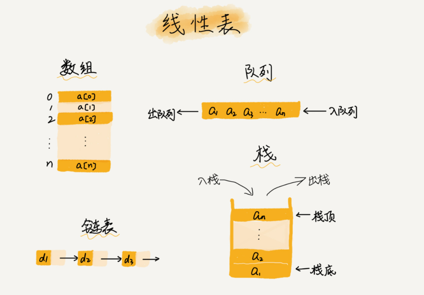 线性表(Linear List)就是数据排成像一条线一样的结构。每个线性表上的数据最多只有两个方向。除了数组,链表、队列、栈也是线性表结构。
