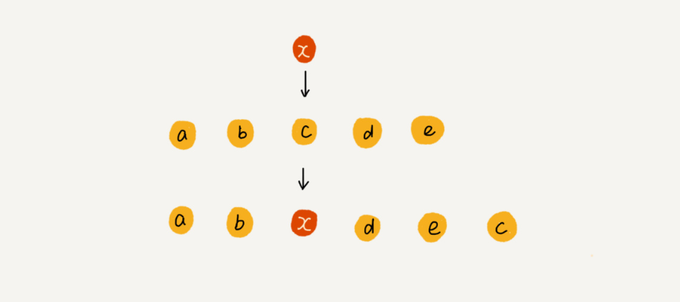 我们现在需要将元素 x 插入到第 3 个位置。我们只需要将 c 放入到 a[5],将 a[2] 赋值为 x 即可。最后,数组中的元素如下: a,b,x,d,e,c。