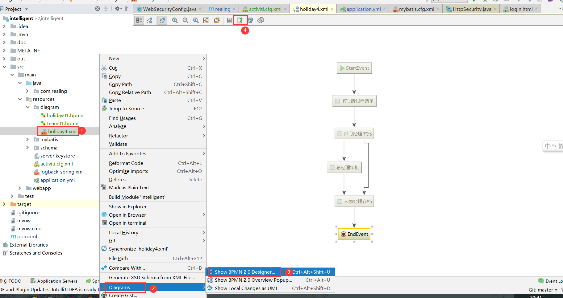 绘制流程图:resource目录下新建diagram文件夹,在文件夹中右击新建bpmn文件