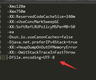 一行追加一条命令: -Dfile.encoding=UTF-8