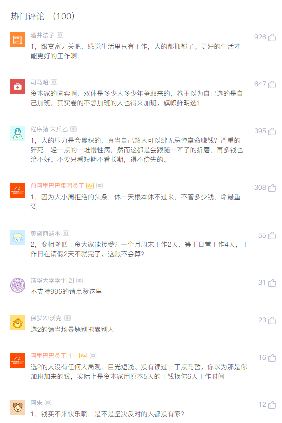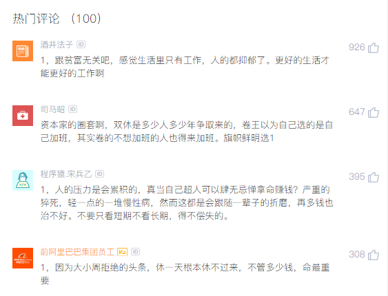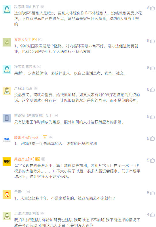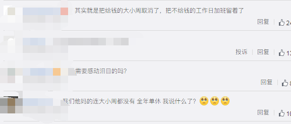 然后再说一下支持取消大小周的观点,其实从评论中能看出大部分是支持取消大小周的,我更能理解支持取消大小周的朋友,主要有两点,一个是身体素质的下降,长时间坐在电脑面前敲代码对身体伤害很大的,如果是双休的话,就有更多的时间锻炼身体了,毕竟身体才是革命的本钱。其二是陪伴家人的时间太少了,996的工作模式你私生活真的很少了,如果是双休那会有更多的时间陪家人,周末可以陪小孩。