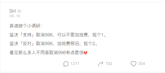 而在六月中旬,字节跳动进行了一次例行 OpenDay,而在这次活动中,对于“字节跳动的大小周工作模式,是否要取消”。根据内部调研,1/3的员工支持,1/3的员工反对。是不是不敢相信居然有1/3的人反对,到底是因为什么,投反对的人是认为双休不好吗?这个话题瞬间引爆了。