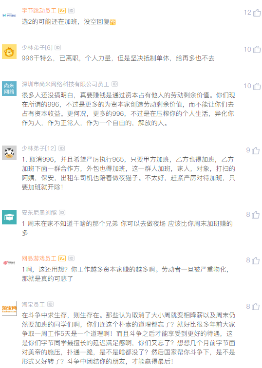 2.很多人还没搞明白,真要赚钱是通过资本占有他人的劳动剩余价值。你们现在所谓的996,不过是更多的为资本家创造劳动剩余价值,而不能让你们去占有资本收益。更何况,更多的996,不过是在压榨你的个人生活,异化你作为人,作为正常人,作为一个自由的,解放的人。