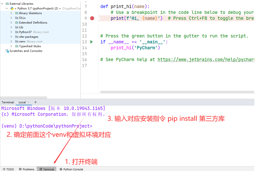 注意:在很多人在 cmd中安装 第三方库 但是pycharm中没有 是因为虚拟环境问题 你需要在 pycharm中安装