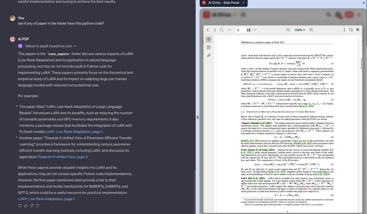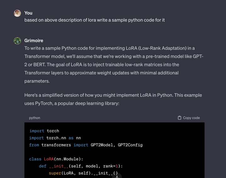 根据一位内测用户的论文复现介绍,首先使用@AiPDF_GPT论文解读工具对LoRA技术的论文进行分析,然后使用Grimoire编码工具根据描述信息编写代码,最终在PyTorch中实现了LoRA简化版的Python代码。