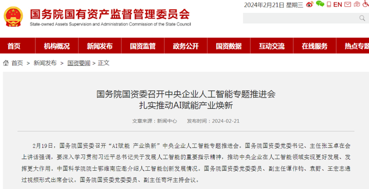 2月19日,国务院国资委召开“AI赋能产业焕新”中央企业人工智能专题推进会。会议强调,中央企业要把发展人工智能放在全局工作中统筹谋划,深入推进产业焕新,加快布局和发展智能产业。把主要资源集中投入到最需要、最有优势的领域,加快建设一批智能算力中心,开展AI+专项行动,强化需求牵引,加快重点行业赋能,构建一批产业多模态优质数据集,打造从基础设施、算法工具、智能平台到解决方案的大模型赋能产业生态。