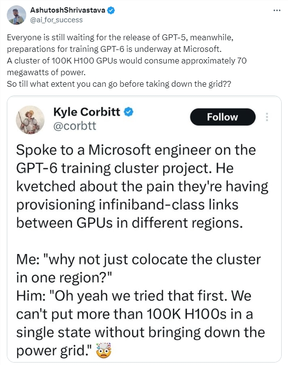 近日微软工程师透露,微软正在为GPT-6的训练部署10万台H100 GPU,在部署过程中遇到了GPU之间扩区域配置无线宽带的问题。而在同一州部署10万台H100,电网会因无法承担巨大负荷而崩溃。