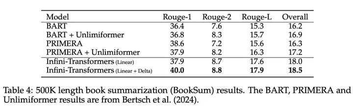 表4 将 Infini-Transformer 与专门为摘要任务构建的编码器 - 解码器模型进行了比较。结果表明 Infini-Transformer 超越了之前最佳结果,并且通过处理书中的整个文本在 BookSum 上实现了新的 SOTA。