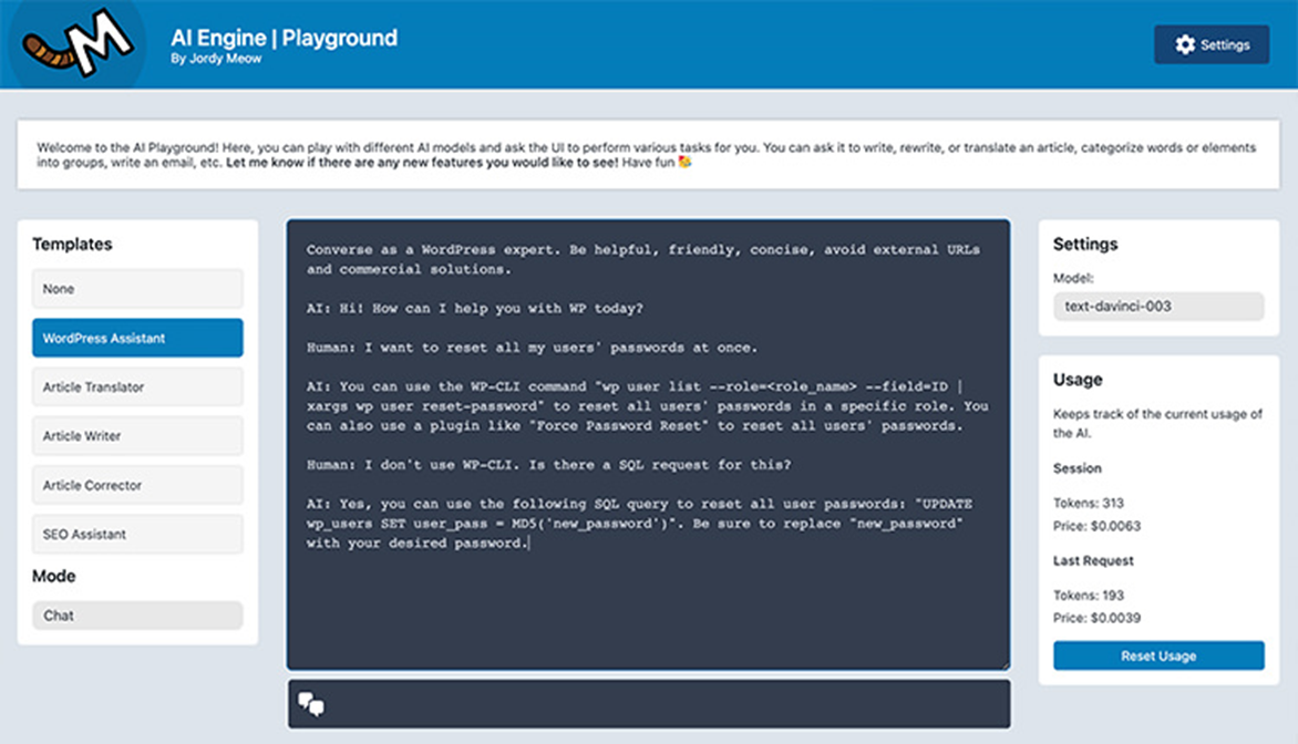 一个WordPress插件,可以通过简单的短代码将ChatGPT风格的聊天机器人添加到您的网站上。您可以在其AI Playground中生成新鲜内容、进行翻译和纠正,并找到建议。 该插件还提供快速的标题和摘录建议,通过内置统计跟踪您的OpenAI使用情况,并具有其他插件可以利用和集成到插件中的内部API。