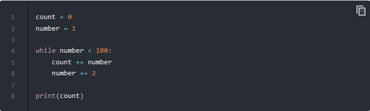 第4-6行: 设定while循环的运行条件(number < 100)及执行语句(count += number;number += 2)