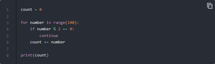 第4-6行: 用if语句判断100以内的数是否为奇数,是奇数就相加(if i % 2 == 0,continue的含义是当数字为偶数时退出本次循环)