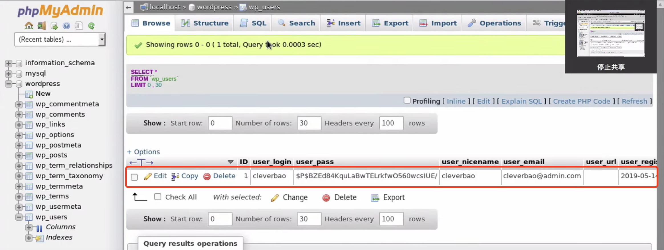 update wp-users set user_pass=md5("123456") where user_login= 'cleverbao';