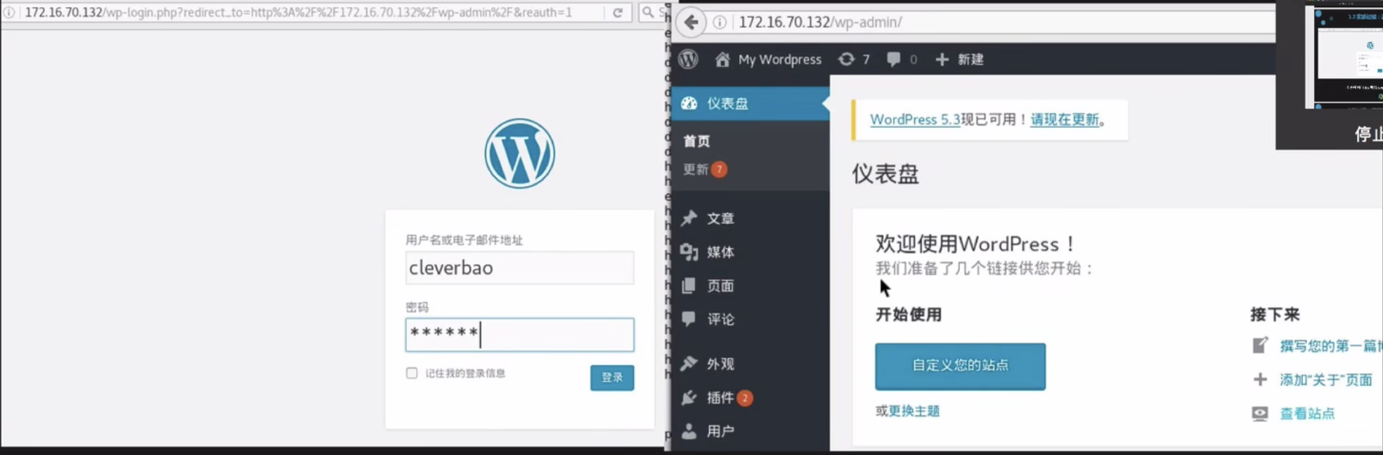在一系列的操作完成后,我们就可以正常的去登陆后逃跑://靶机ip/wp-admin,输入账号密码。进入后台