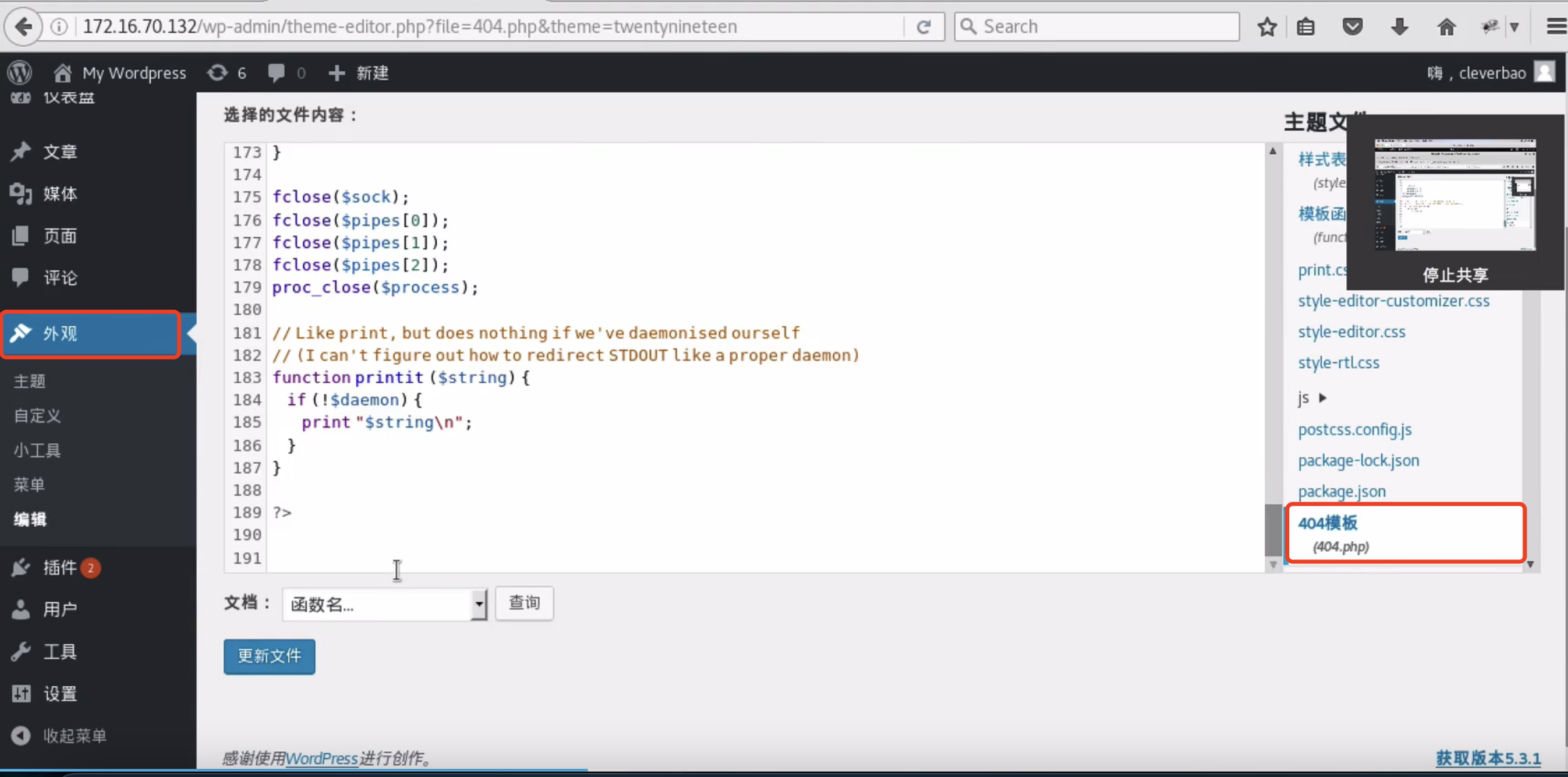 点击外观,选择里面的编辑,选择404模版,将代码复制到404模版插入反弹shell